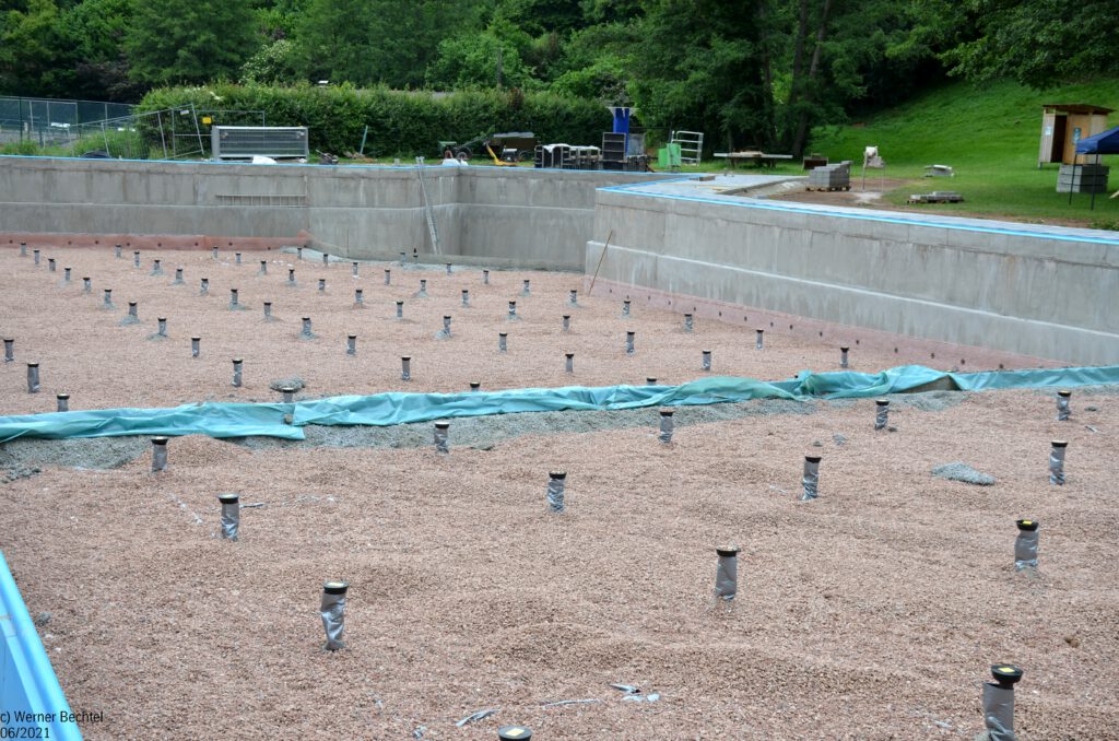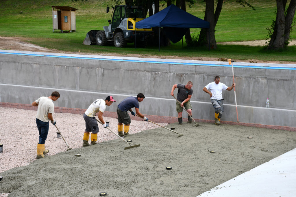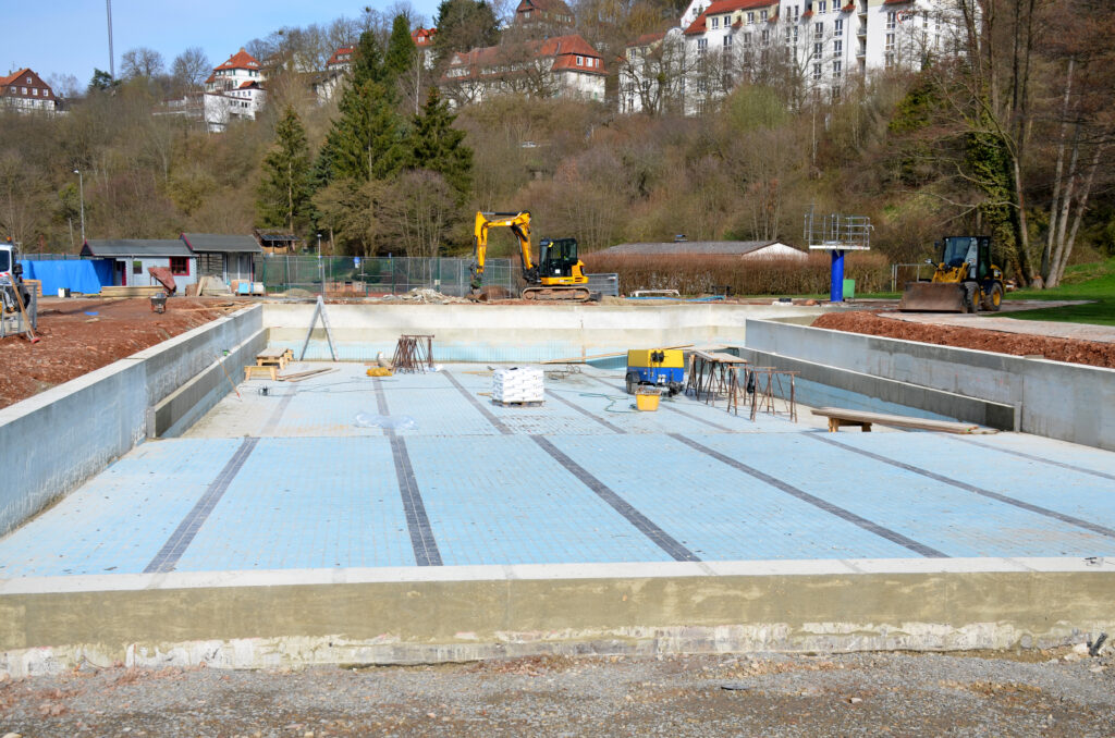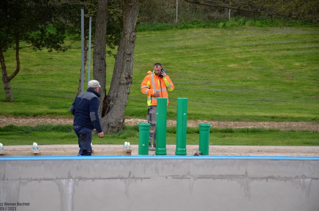 Ständige Reparaturen am Becken, wackelnde Gehwegplatten und in die Jahre gekommene „Attraktionen“ wie Rutsche, Sprungtürme und Startblöcke konnten erahnen lassen, dass etwas passieren muss. Besonders die seit Jahren immer mal großflächig abfallenden Fliesen im Becken bereiteten Kopfzerbrechen. Am Tag der Saisoneröffnung 2019 brach mitten im Badebetrieb wieder ein größeres Stück heraus und so mussten die Männer der „Task Force“ und ein kompetenter Fliesenleger ran, um es zu richten. Es hat geklappt, aber spätestens ab da war klar, dass es so nicht weitergeht.